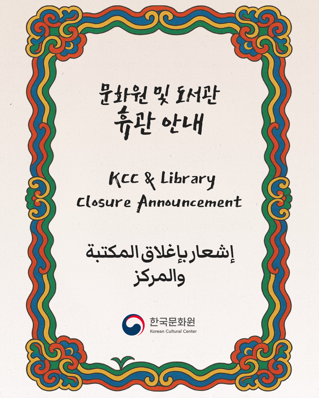 Please be noted that the Korean Cultural Center and Library will be closed on the 4th of January, 2026 (Sunday) for maintenance. Thank you.