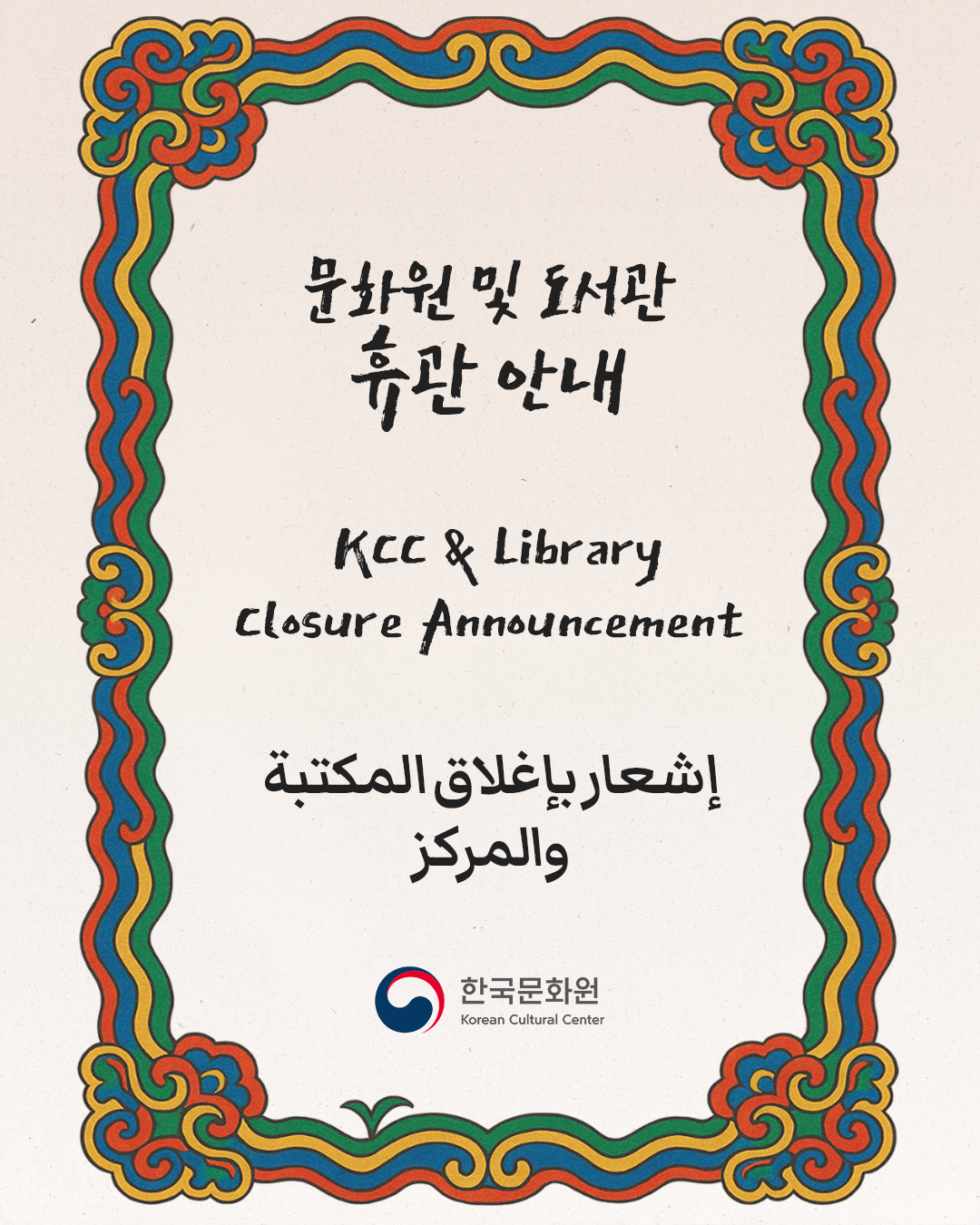 Please be noted that the Korean Cultural Center and Library will be closed on the 7th (Friday) & 9th (Sunday) of November.