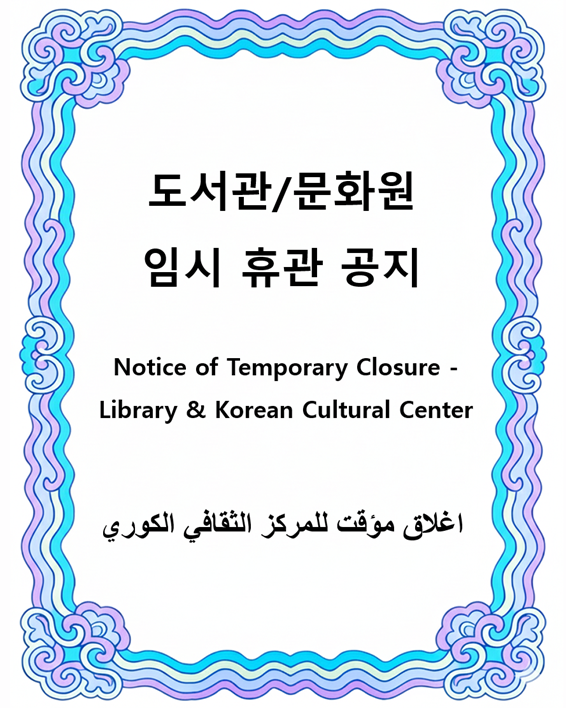 한국문화원과 도서관은 3월 2일(월)~4일(수)까지 임시 휴관임을 알려드립니다.